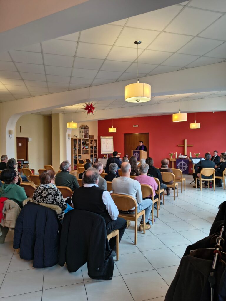 Am celebrat împreună atât serviciul divin în limba germană, cât și pe cel în limba română. În cadrul serviciului divin în limba română, Pastorul Reinhard Suciu ne-a adresat un călduros cuvânt de salut. Fratele Florin Ludușan a susținut apoi cuvântul de învățatură (Geneza 3, 1-19) și a rostit rugăciunea universală împreună cu Preotul Mihai Udrea.